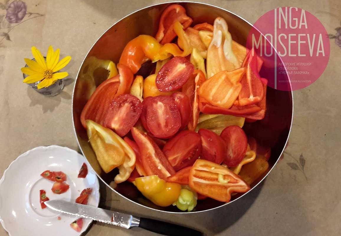 1. Приступим? Овощи тщательно промойте под проточной водой. Удалите у перцев семена, у томатов удалите жесткую сердцевину и часть, которая соединяется с веточкой.