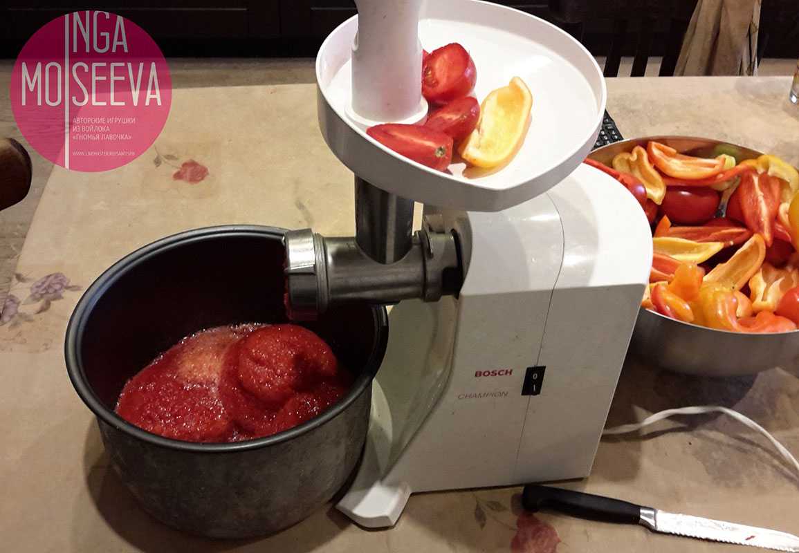 - Перекрутим через мясорубку томаты. Используем насадку крупного диаметра.