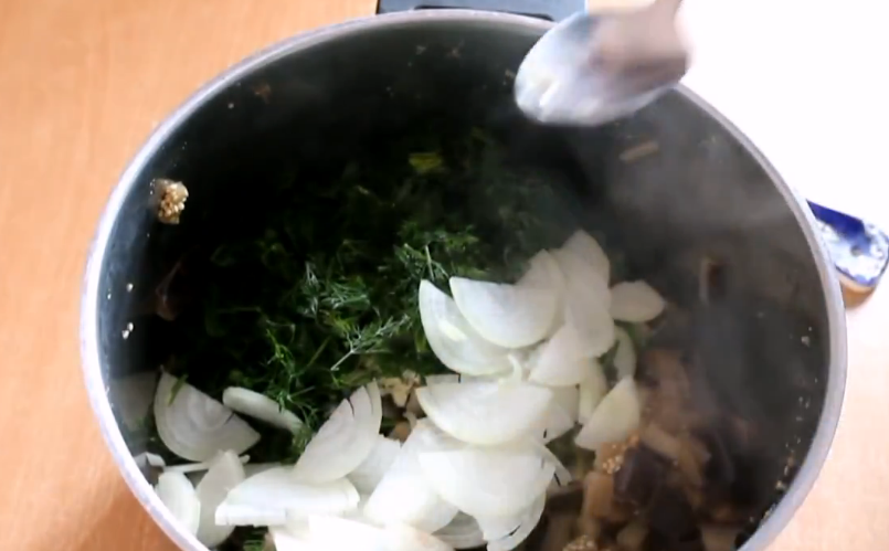 5. Воду из кастрюли сливаем, а в горячие баклажаны добавляем нарезанные репчатый лук, чеснок, укроп.