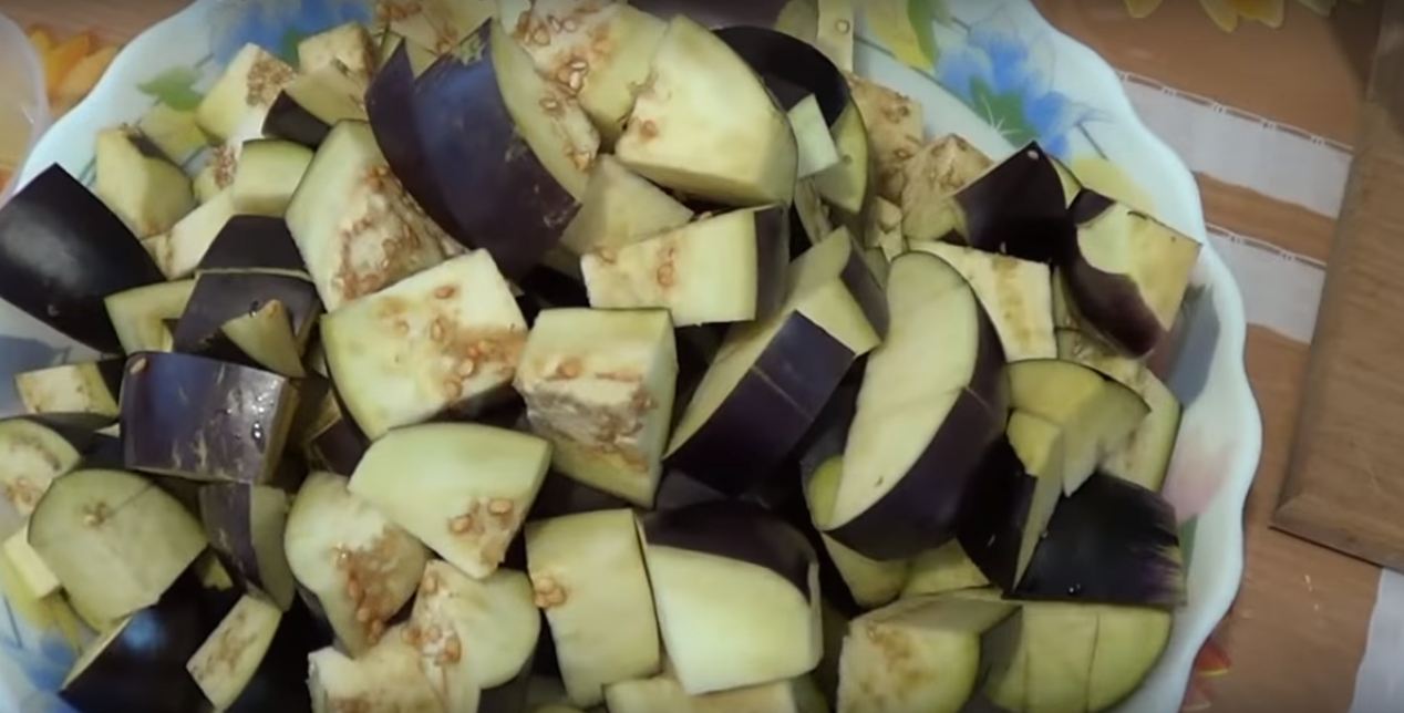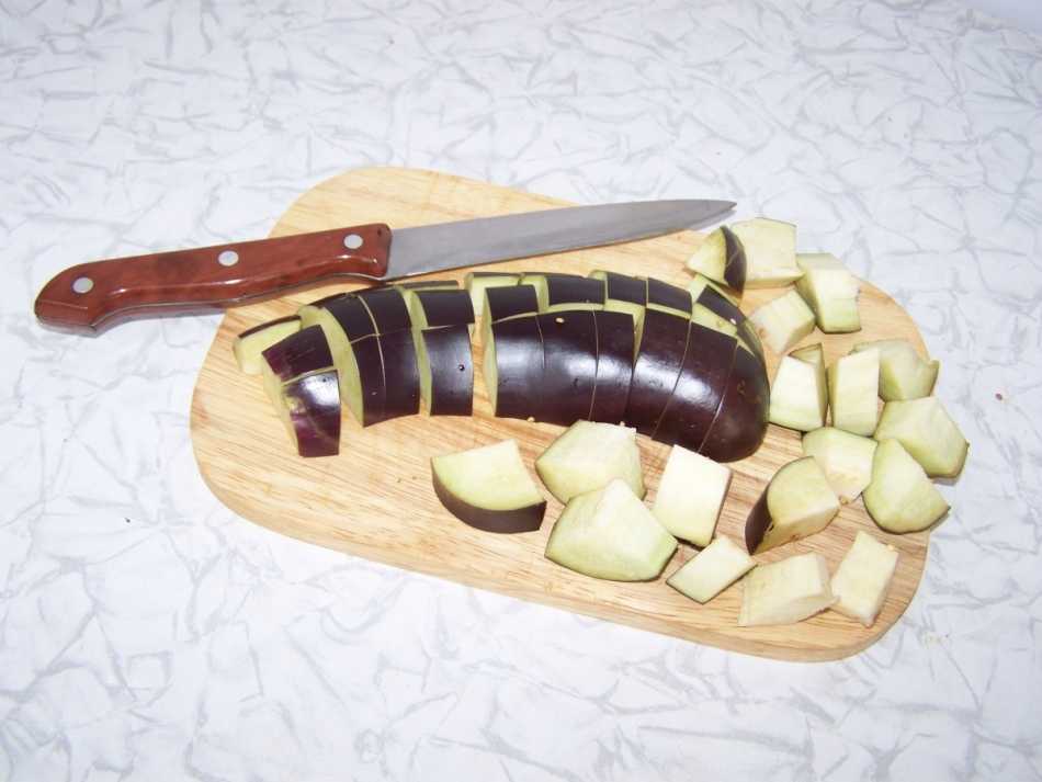 Для маринования баклажанов «под грибы» нарезаем их кубиками