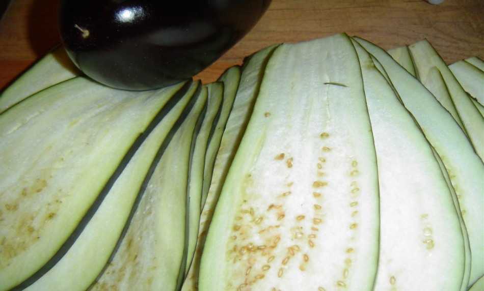 Для маринования баклажан по-грузински режем их тонкими пластинами