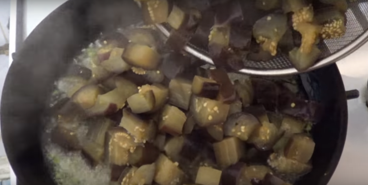 Наливаем половину большой кастрюли воды, сильно солим и даем закипеть. Партию баклажанов выкладываем в эту кастрюлю, сколько поместится, и накрываем их крышкой.