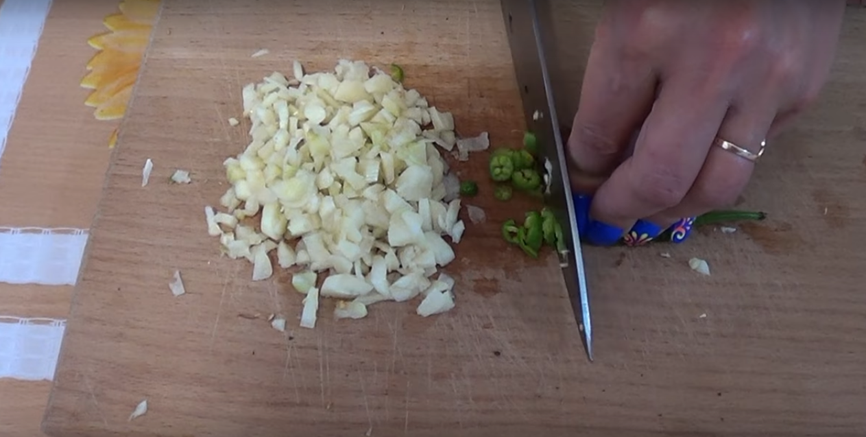 Сразу же нарежьте чеснок и горький перец, чтобы не тратить на это время потом.