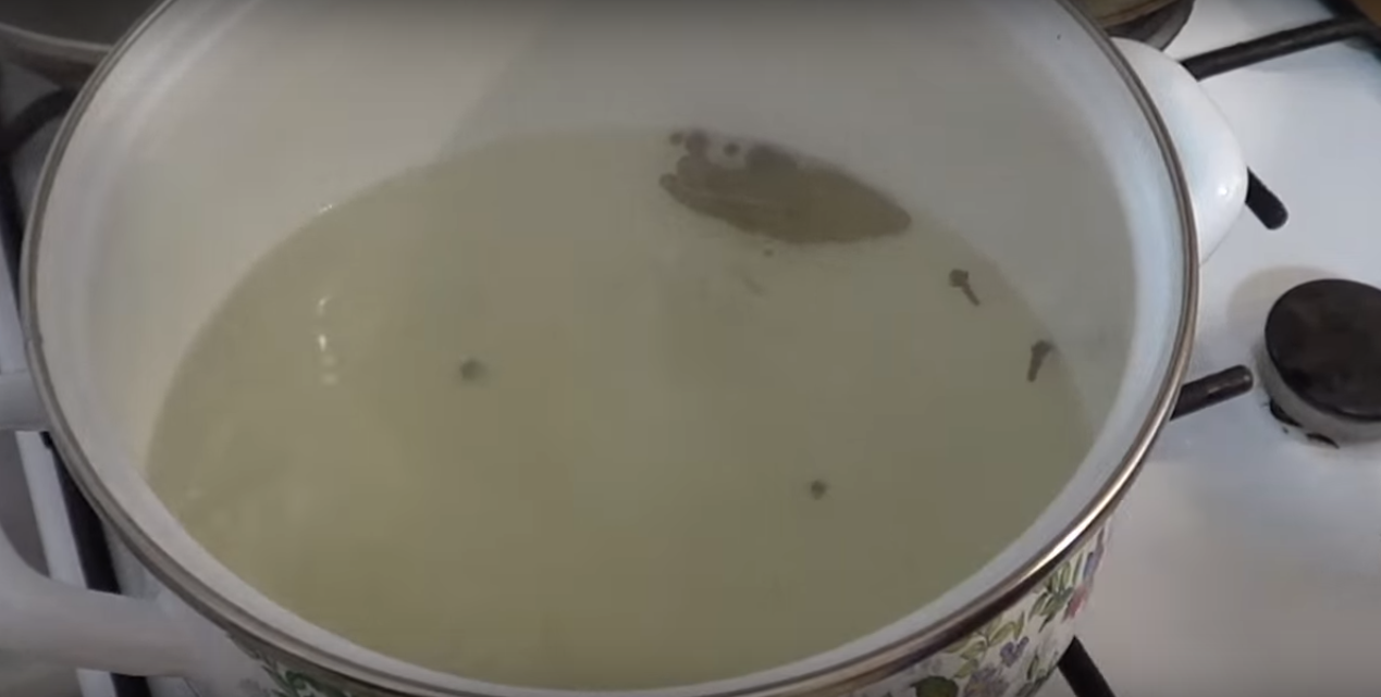 Тем временем смешиваем в кастрюле все ингредиенты для маринада, заливаем все водой, накрываем кастрюлю, отправляем на средний огонь.