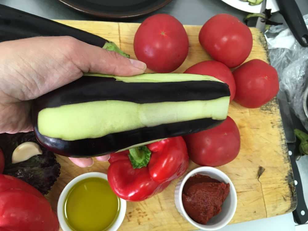 - Подготавливаем все овощи – вымываем в прохладной воде, просушиваем кухонным полотенцем. Баклажаны разрезаем вдоль на две равные части, предварительно удалив хвостики. Каждую половину реже брусочками средней толщины. Нарезка не должна быть мелкой, иначе вы просто рискуете блюдо превратить в икру.