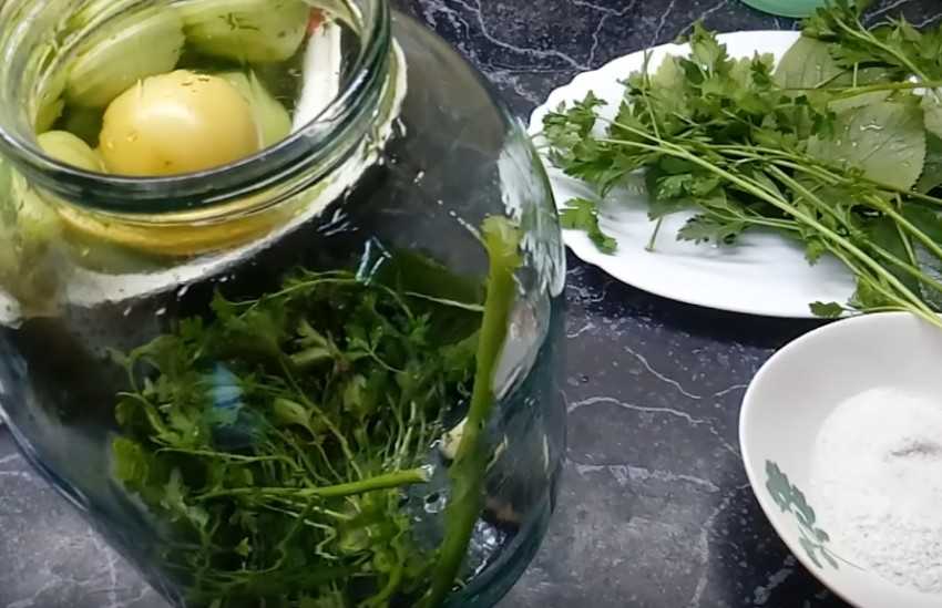 1. Хорошо вымойте трехлитровую стеклянную банку содой, не стерилизуйте. На дно сложите половину зелени, порезанный на 4 части или половинки чеснок, семена горчицы.