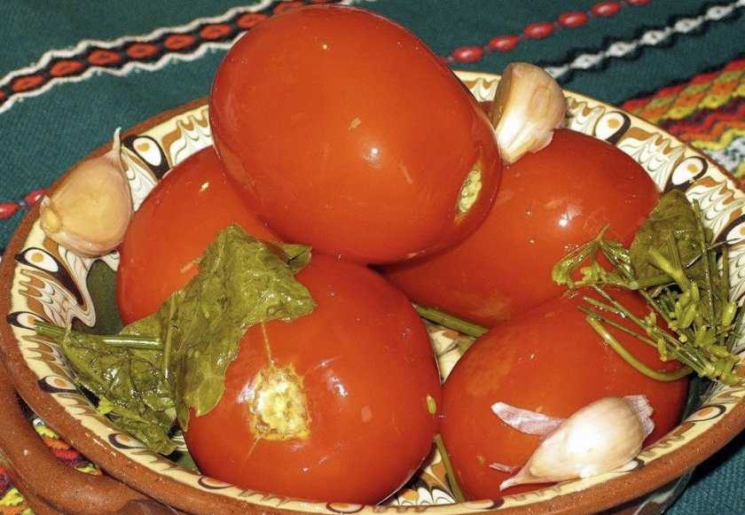 - плотные бурые помидоры, в надрез возле плодоножки которых вставлена пластинка из зубчика чеснока.