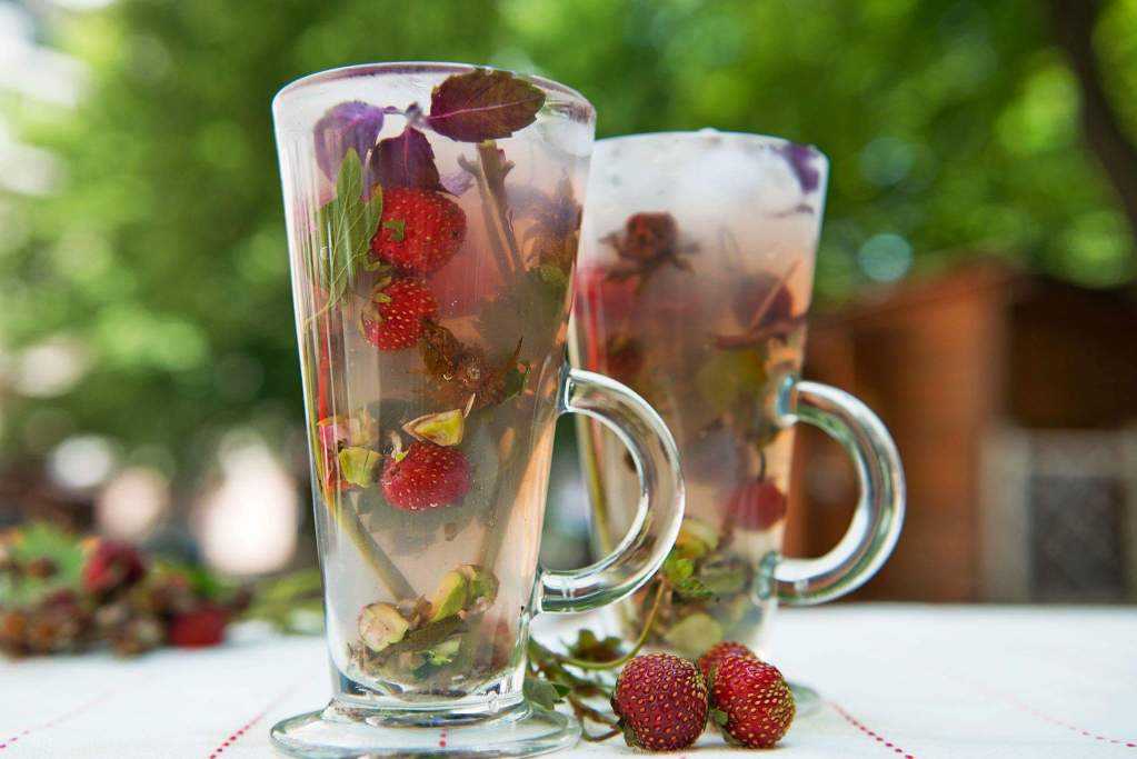 - Объединить в одной посуде чай и сироп из клубники с ягодами.