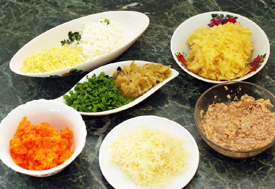 На первом этапе проваривается куриная грудка в подсоленной воде, а затем измельчается. Далее отваривается картофель и яйца. А вот морковь можно запечь в духовке, она придаст вкус и сладость в блюдо.