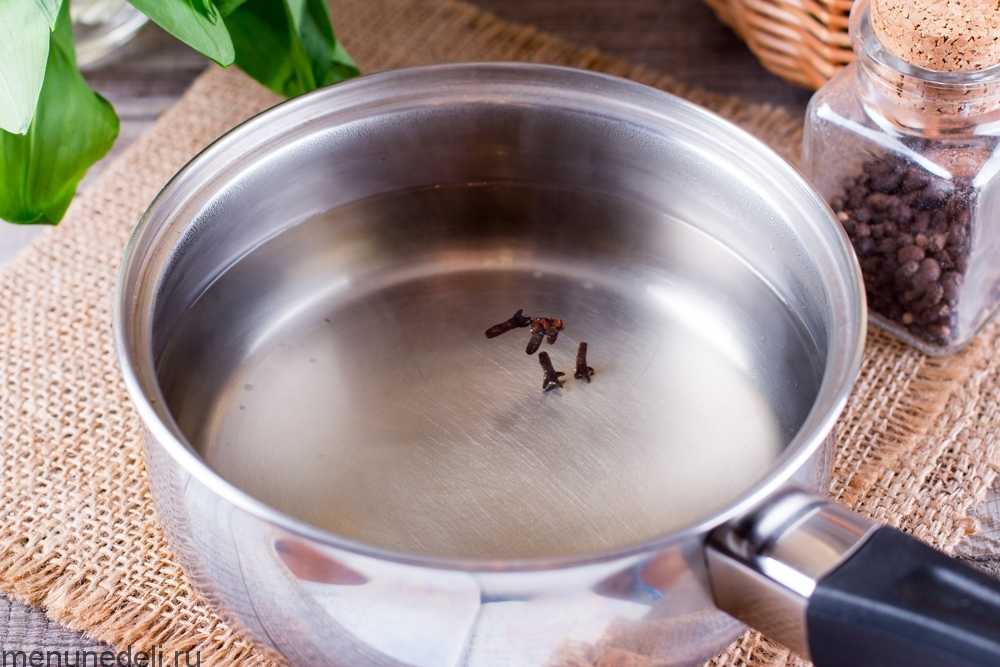 Пока черемша охлаждается, вскипятить 1 л воды, добавить соль, сахар и 3-4 бутона гвоздики. Хорошо перемешать, чтобы соль и сахар растворились, еще раз довести до кипения.