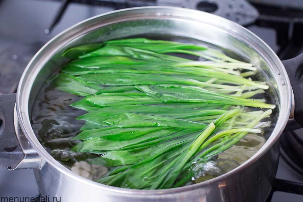 Аккуратно поместить черемшу в кипящую воду ровно на 1 минуту с момента погружения. Дольше держать зелень в кипятке не следует, иначе растение быстро сварится, потеряет цвет, форму и большую часть полезных веществ.