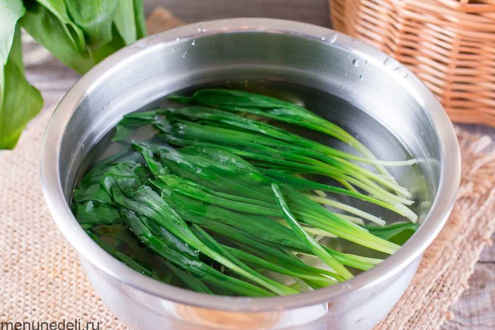 Её следует очень тщательно промыть от песка, пыли или грязи. Для этого необходимо набрать в глубокую миску холодной воды и погрузить в неё черемшу. Прополоскать её руками и слить воду. Повторить процедуру дважды, а если вода слишком грязная, то и третий раз промыть ароматную траву.