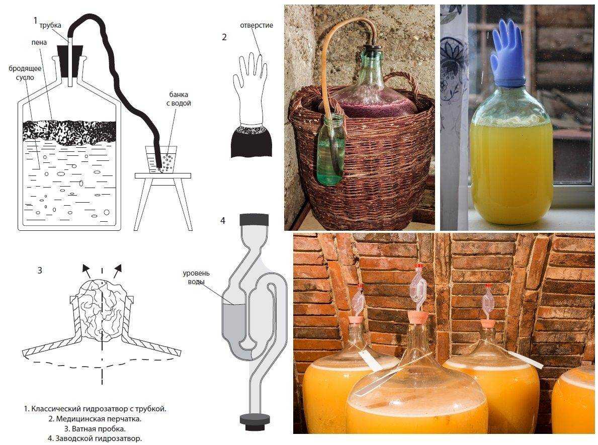 Перелив сусло в чистый бутыль, на него устанавливают гидрозатвор или надевают медицинскую перчатку. Заготовку выдерживают полтора месяца при комнатных условиях. Если спустя назначенное время брожение не прекратилось, будущее вино опять аккуратно сливают и снова ставят под затвор. Это нужно делать для того, чтобы предотвратить появление неприятной горечи в готовом продукте.