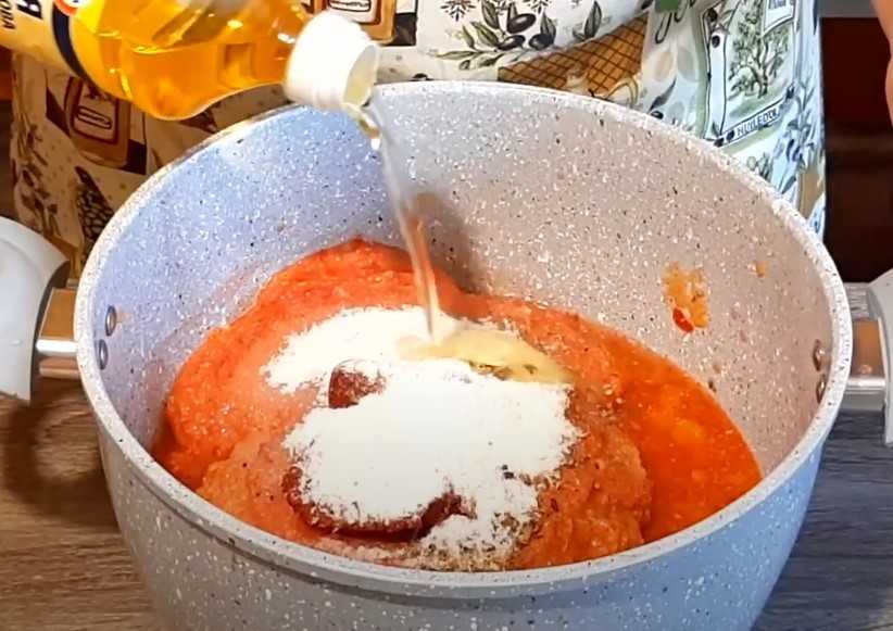 - Овощную смесь перекладываем в эмалированную кастрюлю и ставим на средний огонь. К заготовке нужно добавить соль, сахар и растительное масло. Все ингредиенты нужно тщательно перемешать, довести до кипения и протушить под закрытой крышкой в течение получаса.