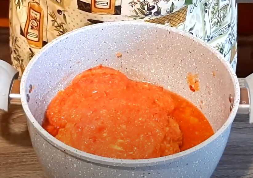 4. На сковороду наливаю две столовых ложки масла и выливаю туда помидорную массу. Буду её тушить отдельно, как самую жидкую составляющую нашей аджики.
