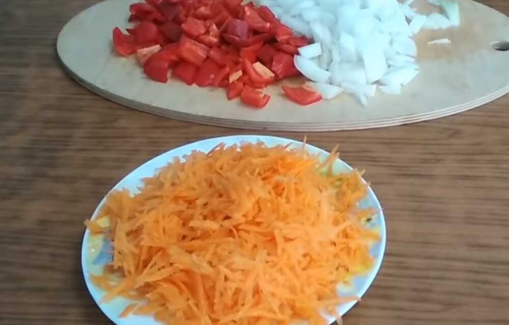 Тем временем займемся остальными овощами. Болгарский перец моем, убираем плодоножку, очищаем от семян. С лука снимаем кожицу и всё нарезаем на мелкие кубики. Морковь очищаем от грязи и трем на крупной терке.