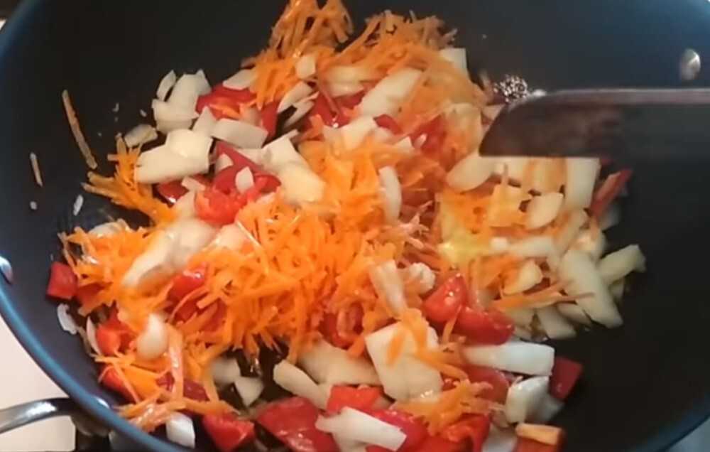 Берем сковороду, наливаем в неё растительное масло и обжариваем овощи, а именно болгарский перец, лук и морковь до золотистого оттенка.