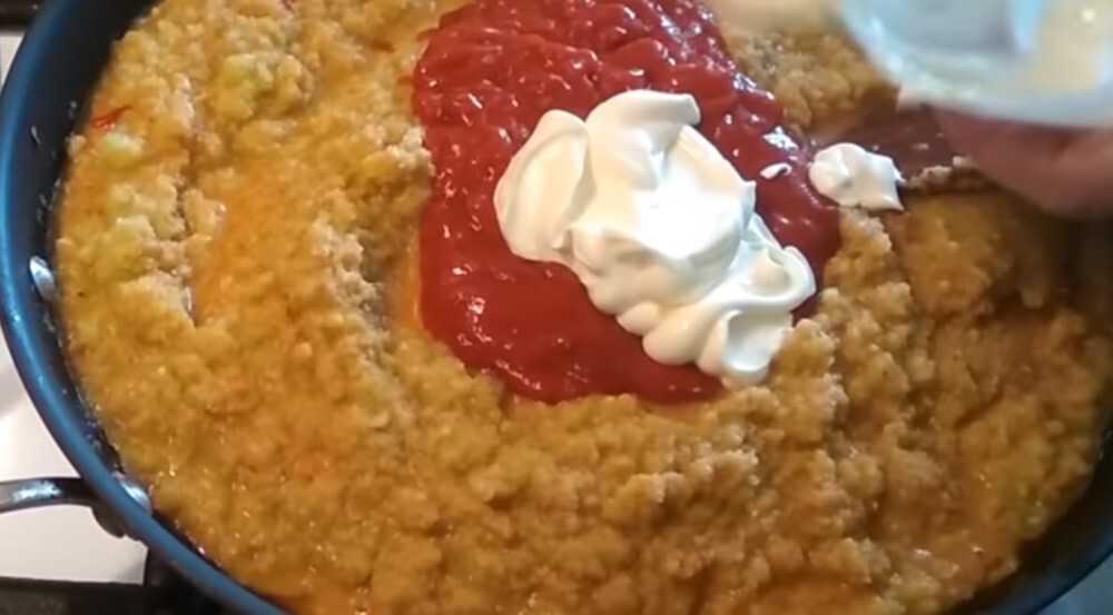 Выкладываем в глубокую чашу или ёмкость однородную массу, к ней отправляем кетчуп и майонез. Все хорошо перемешиваем.