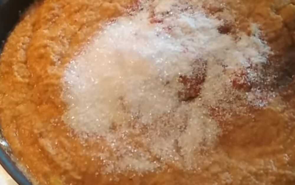 - Переложите все в чистую кастрюльку и, используя погружной блендер – измельчите будущую заготовку. Добавьте корейскую приправу, перемешайте и только потом – соль и сахар на свой вкус. Тщательно вымешайте икру и прокипятите ее минуты 2-3.