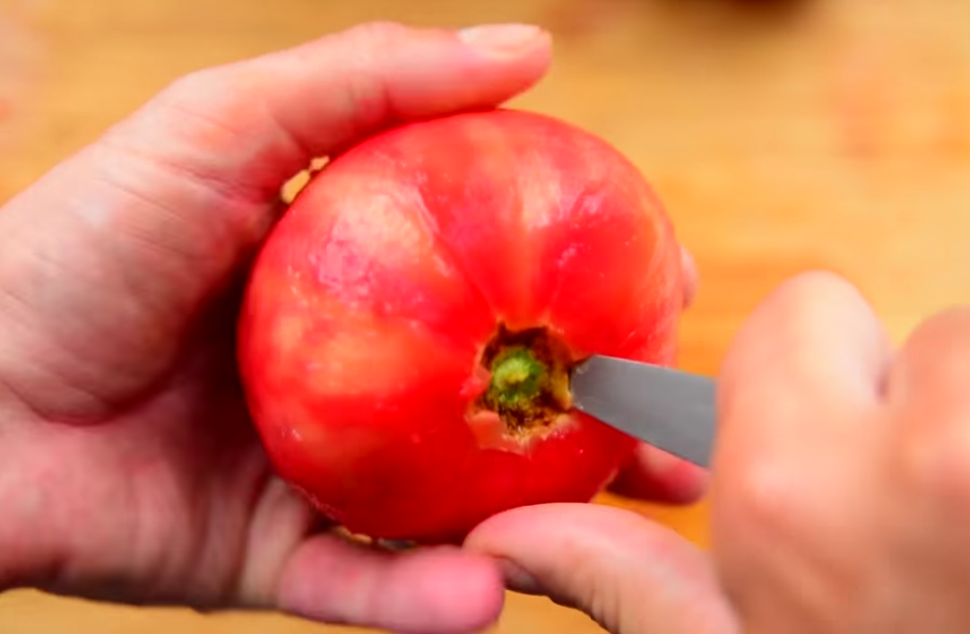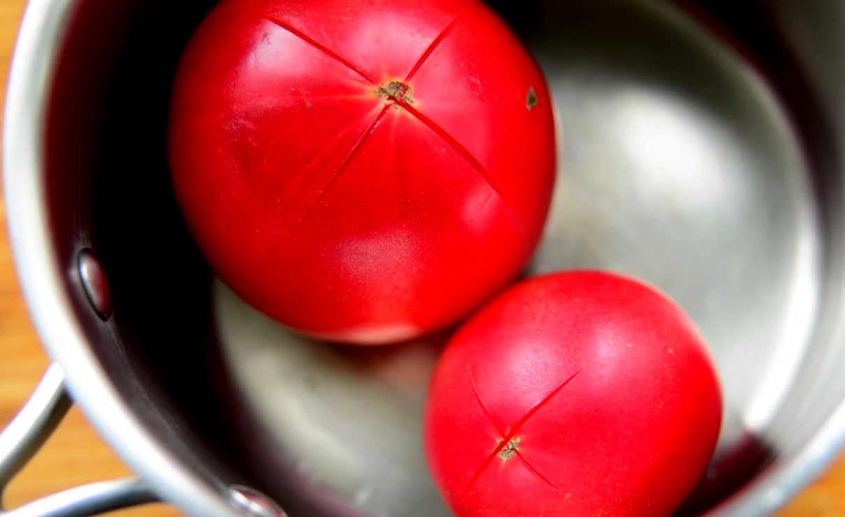 2. Также очень важным компонентом являются помидоры, они должны спелыми, вкусными и неиспорченными. Нам нужно очистить помидоры от кожуры, для этого делаем сверху крестообразный надрез, опускаем в кипяток на 1 минуту и перекладываем в холодную воду.