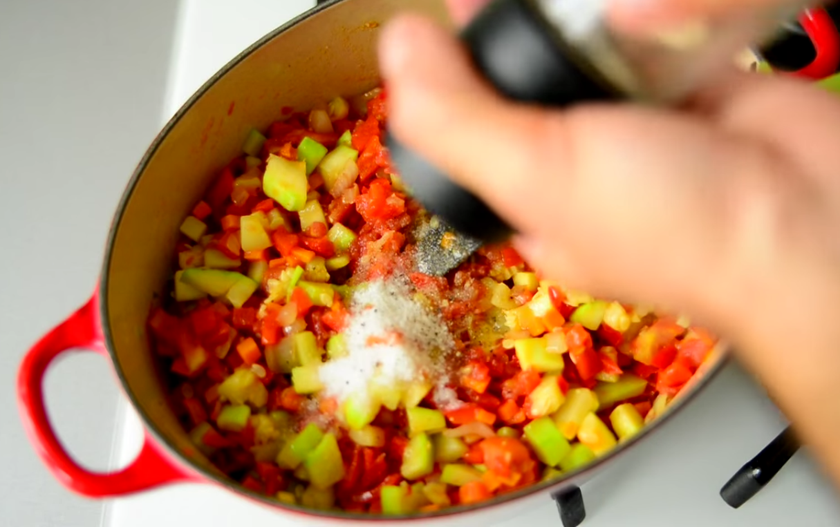 - Когда все будет готово, положим в посудину все промолотые овощи и, доведя до кипения, тушим с час. В конце, минут за 10 до выключения, введем растолченный чеснок, промолотые в мясорубке помидоры и посолим-поперчим по вкусу и вольем уксус.
