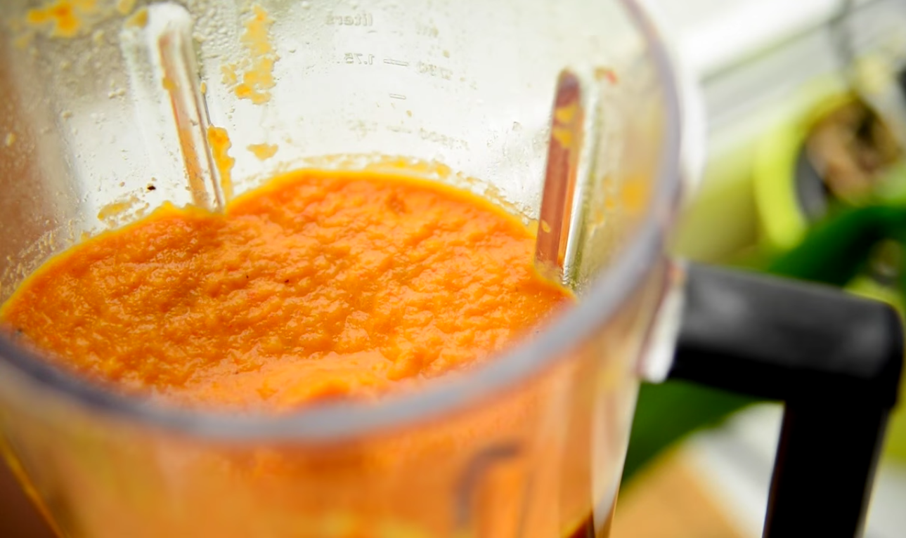 10. Далее настало время из наших ингредиентов делать одну массу. Сделать это можно с помощью погружного блендера, прямо в посуде, в который мы томили. А можно переложить в обычный блендер. Не забывайте, что наши овощи горячие, не обожгитесь!