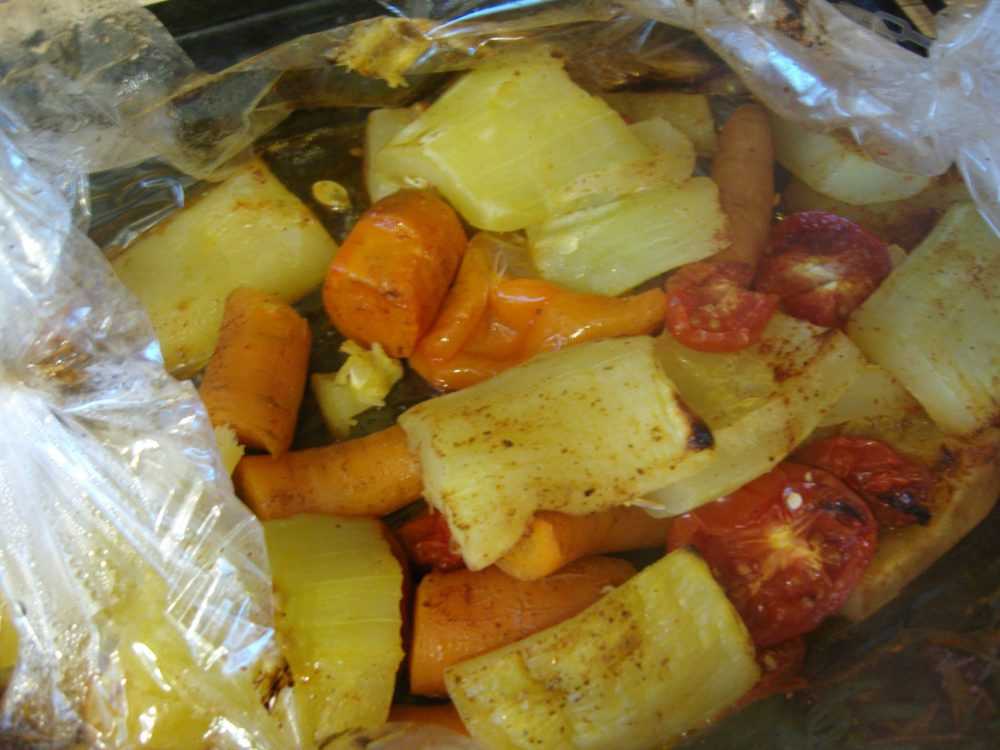 3. Далее очищенный лук четвертинками, пару зубчиков чеснока (это по желанию, для аромата), четвертинки помидоров. Полейте сверху овощи маслом и отправьте в горячую духовку на 1 час, температура 180-200 градусов.