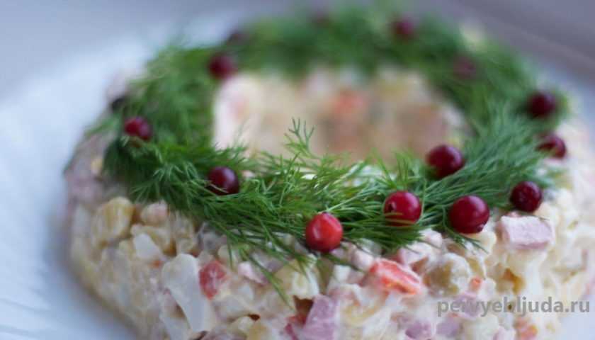 К Рождественскому или новогоднему столу оливье можно украсить в виде венка. Для этого используйте веточки свежего укропа и красные ягоды смородины или клюквы, можно украсить ягодами черники.