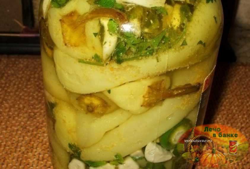 - В стерилизованную банку укладывается зелень и чеснок из маринада, на эту основу выкладываются чили, а на них укладываются все специи, которые участвовали в варке маринада.