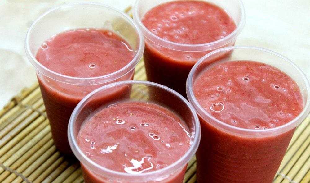 - Наполняем пакеты для льда перетертой клубникой без варки и отправляем в морозилку до зимы.