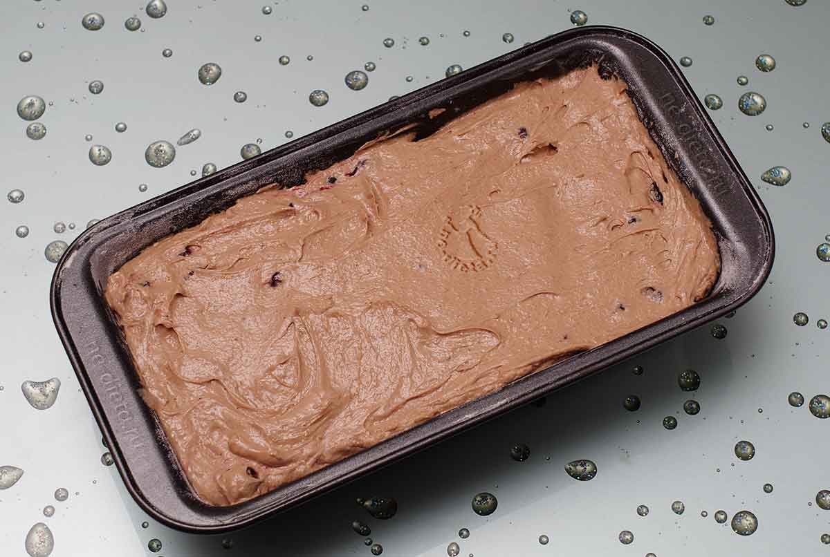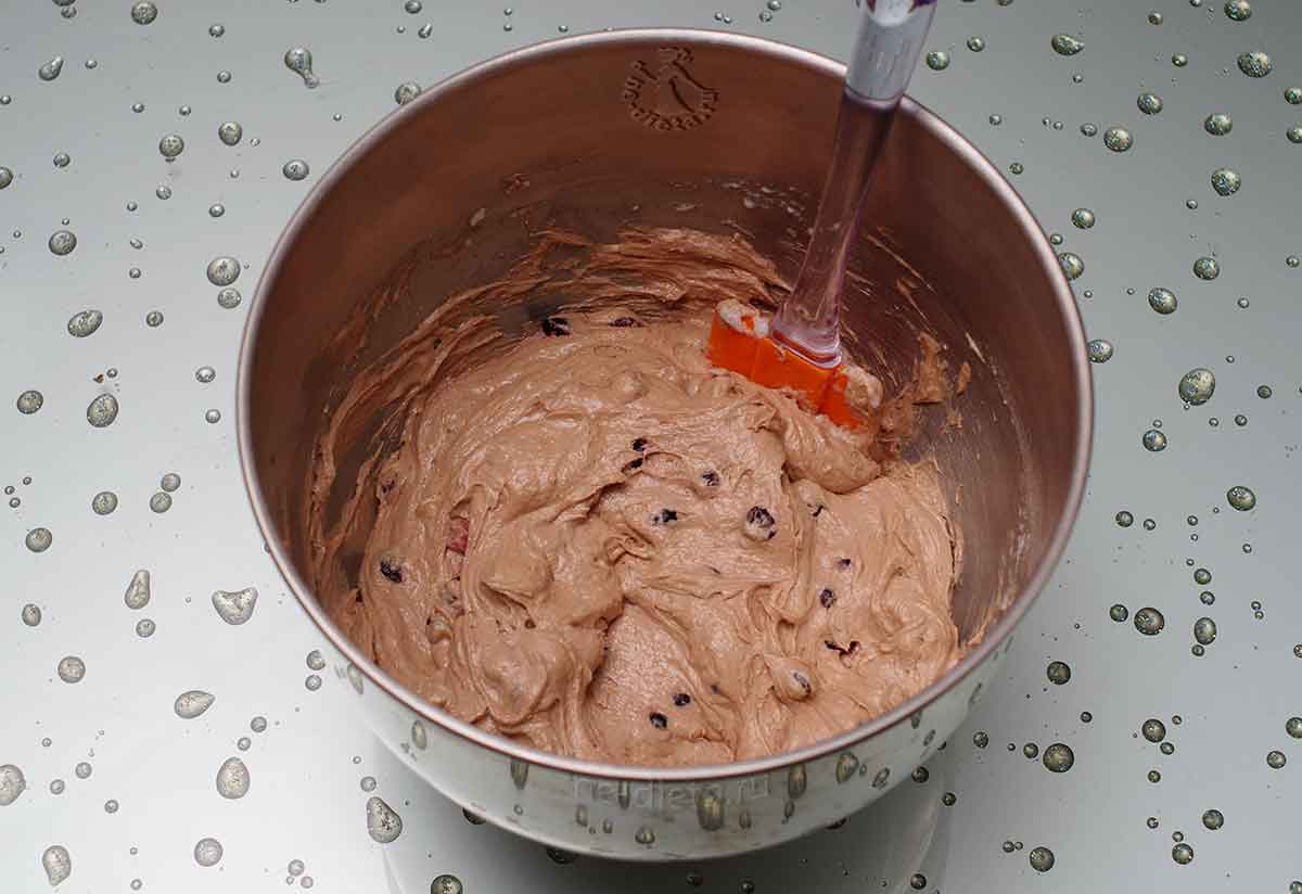 9. Положить смородину в тесто вместе с оставшимися белками и уже без миксера, очень аккуратно, но тщательно все перемешать, чтобы не повредить ягоды. Нежное текучее тесто для шоколадного кекса с черной смородиной готово!