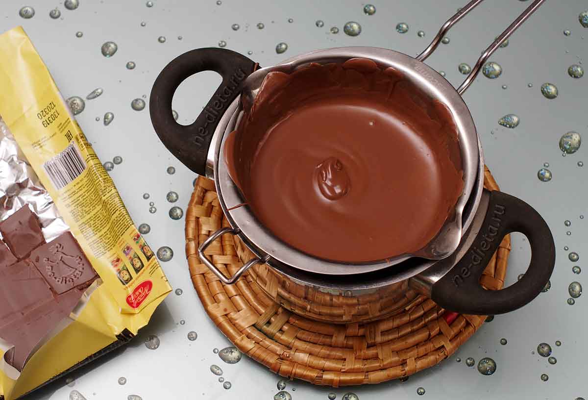 5. Шоколад поломать на квадратики и растопить на водяной бане или в микроволновой печи в однородную блестящую массу без комочков.