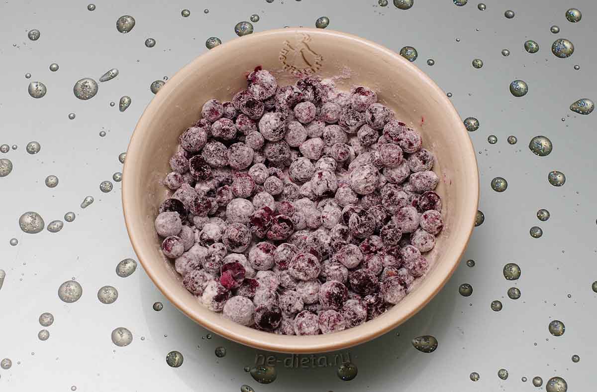 8. Черную смородину вымыть, обсушить и перебрать от мусора и поврежденных ягод, после чего аккуратно смешать со столовой ложкой муки.