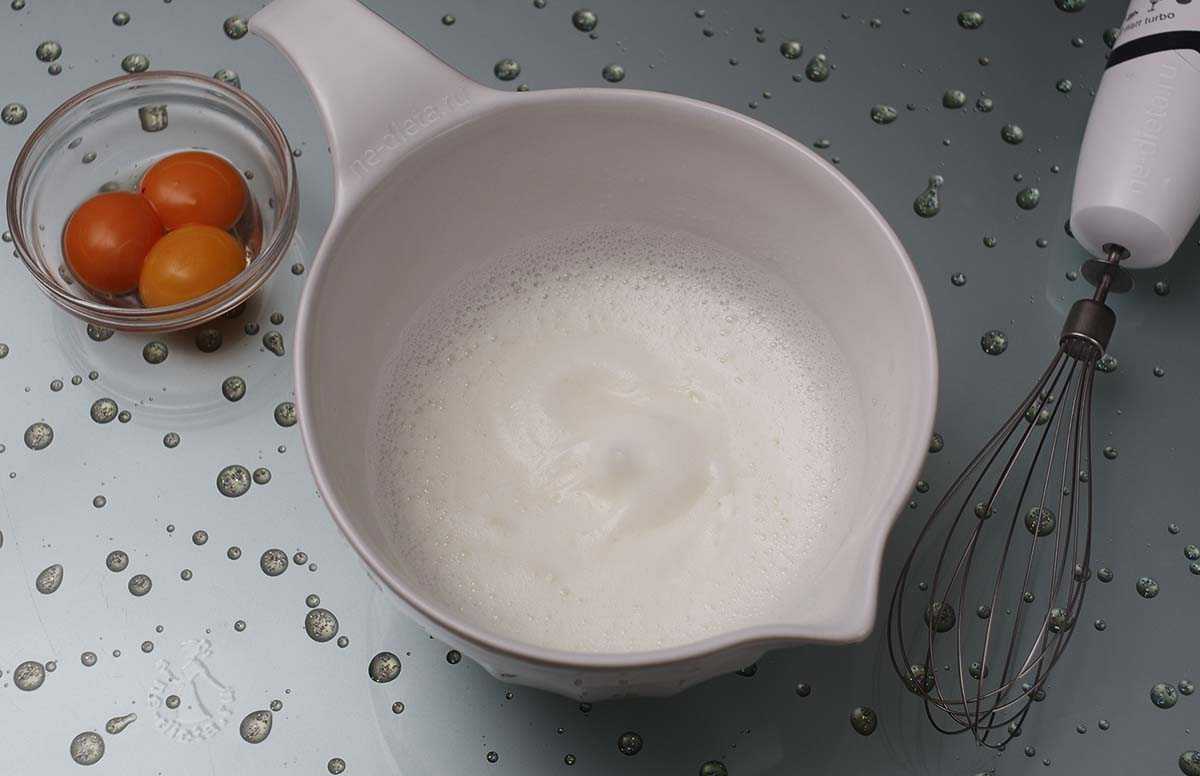 3. Охлажденные яйца разделить на белки и желтки. Белки интенсивно взбить миксером в течение 2 – 3 минут до получения высокой устойчивой пены и на время отставить в сторону.