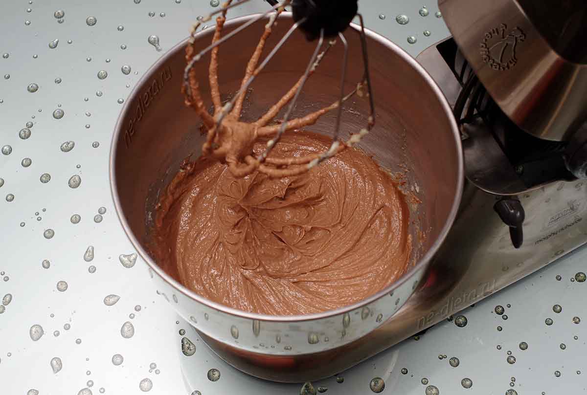 Добавляем четыре столовых ложки качественного какао-порошка и постепенно вводим полтора стакана муки (260 грамм), вмешивая ее частями, чтобы не было комков. Тесто получится довольно густое.