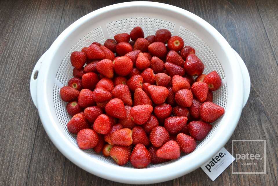 - Клубнику помойте, дайте ей обсохнуть. Извлеките чашелистики. Крупно нарежьте ягоду. Сложите в миску или кастрюлю.
