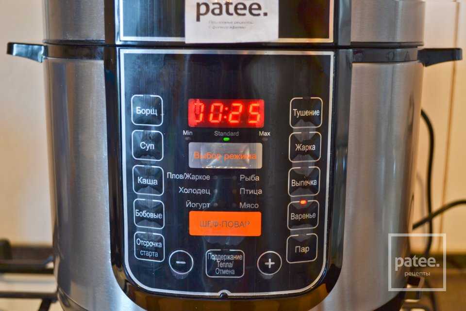 3. Закрываем крышку мультиварки, после чего включаем режим «тушение» и устанавливаем время 1 час ровно. (В процессе приготовления главное – не забывайте вовремя снимать пену).
