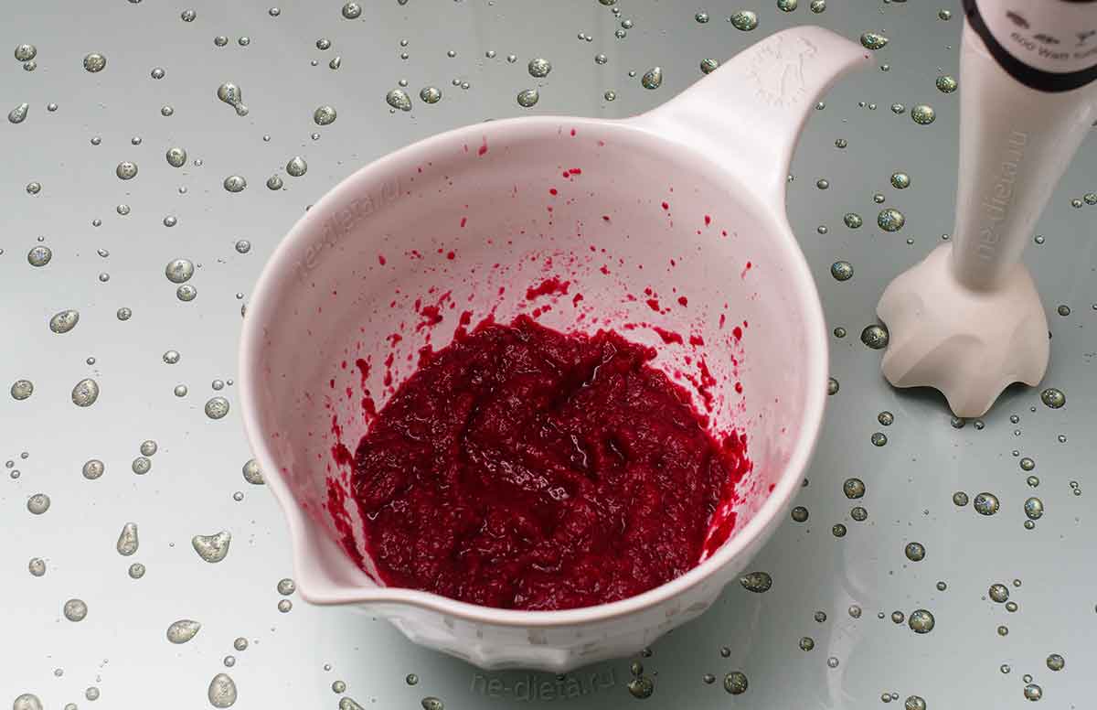 - Измельчают клюкву пестиком или в блендере, сок отжимают, убирают в холодильник.