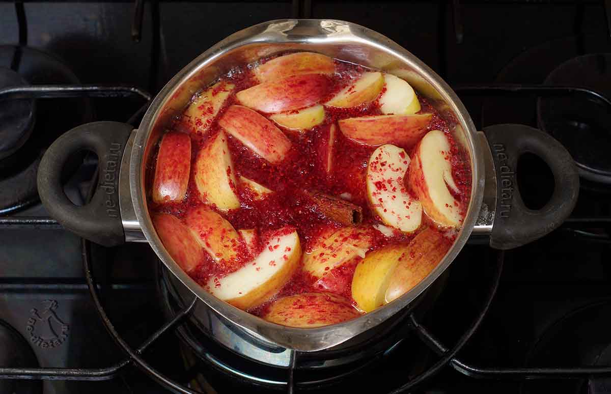 5. В кастрюле среднего размера вскипятить воду, опустить в нее яблоки и готовить при небольшом кипении в течение 2 минут.