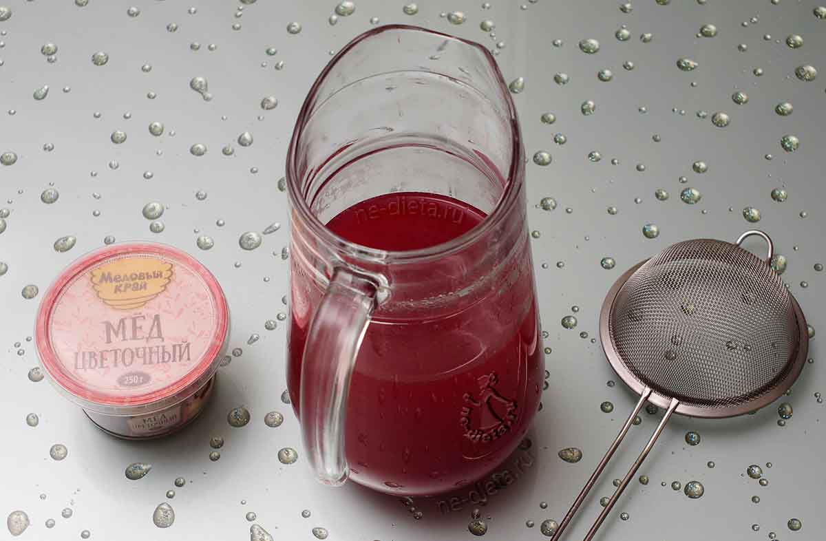 7. После этого напиток снять с огня, накрыть крышкой и дать ему настояться в течение 20 – 30 минут. Как только морс остынет до слегка горячего состояния, его надо профильтровать через сито в кувшин или другую подходящую емкость, добавить к нему клюквенный сок и подсластить медом до того вкуса, который вас устраивает.