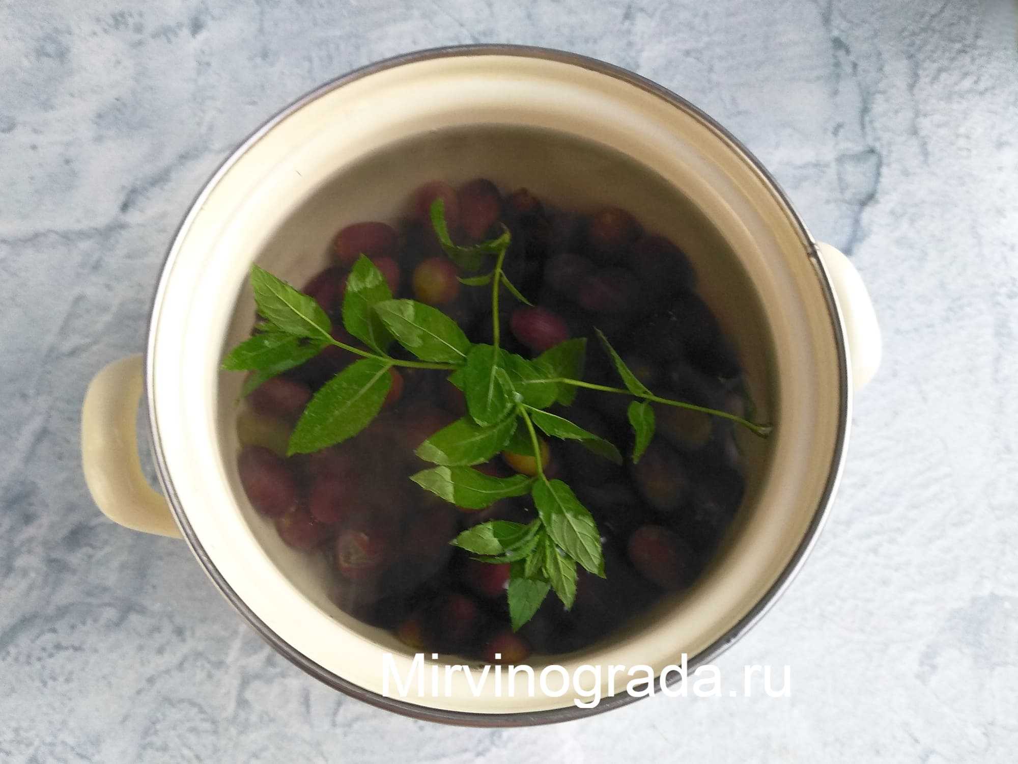 Мало найдётся ягод, способных поспорить с Изабеллой ароматом. Настолько он силён и непохож на другие сорта, что даже в винах нередко к Изабелле добавляют виноград попроще. Нам же для компота такие ягоды просто подарок – больше останется места в бутыли для воды. Мяту в компоты кладут, с целью придать свежую нотку напитку, но на этот раз у неё ещё одна роль: свежий мятный вкус гармонично сочетается с терпкостью, которую придают компоту виноградные косточки. Заменить сорт винограда в рецепте довольно непросто, но если вы планируете именно освежающий компот тёмного цвета, возьмите Каберне или Молдову, они тоже вкусны и ароматны.