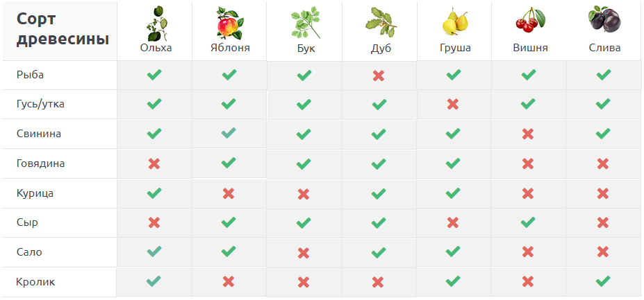 Нельзя использовать щепу хвойных деревьев, ведь копчености получатся горькими и с неприятным запахом, из-за содержания в топливе большого количества смолы.