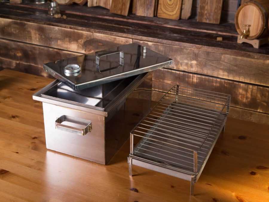 Важное отличие коптилен, в которых дым генерируется в отдельной камере, – его температура ниже, чем в открытом источнике огня, поэтому и дымовой канал нужен не такой длинный. Это означает, что такую коптильню можно использовать даже в квартирных условиях, обеспечив хорошую вентиляцию и обязательный отвод дыма наружу