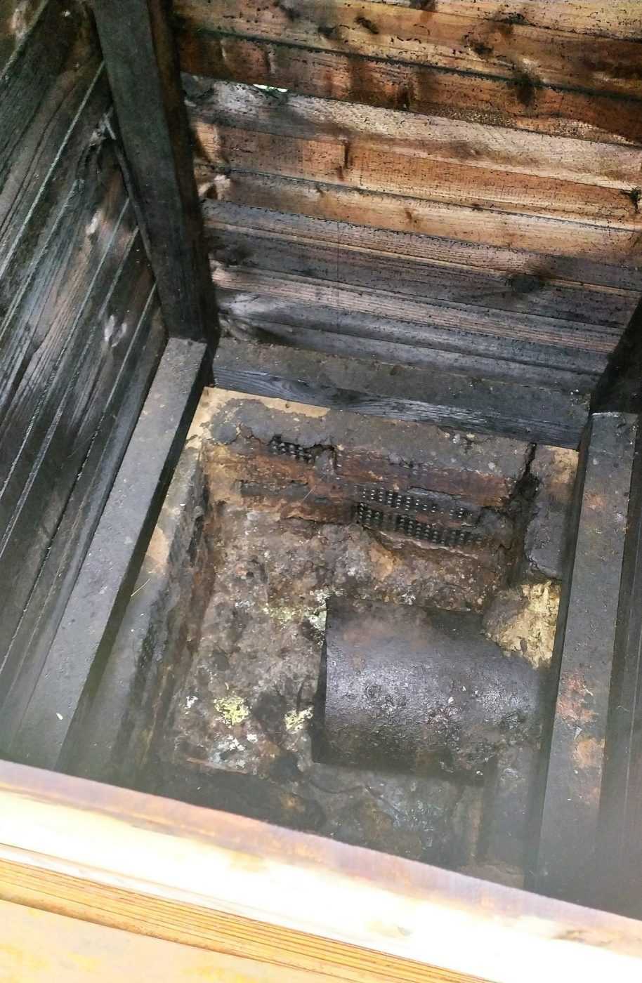 - Дым останавливается гидрозатвором.