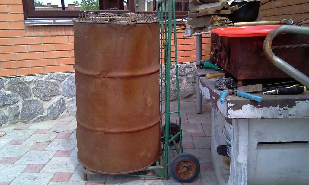 Лучший вариант подобного устройства — коптильня из бочки. У неё более толстые стенки, на них нет внутреннего покрытия. Кроме того, у такого устройства будет значительный объём, позволяющий одновременно коптить большее количество продуктов.