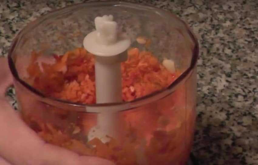 1. В чашу блендера поместите крупно нарезанную морковь, кусочки перца и зубчики чеснока. Для аромата можете еще добавить 2 шт. болгарского перца. Измельчите до получения однородной кашицы. Если блендера нет, пропустите компоненты через мясорубку.
