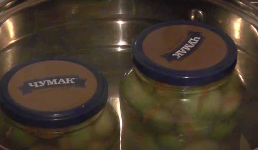 - Стерилизовать заготовку на водяной бане, накрыв баночки обеззараженными крышками, в течение 10 минут.
