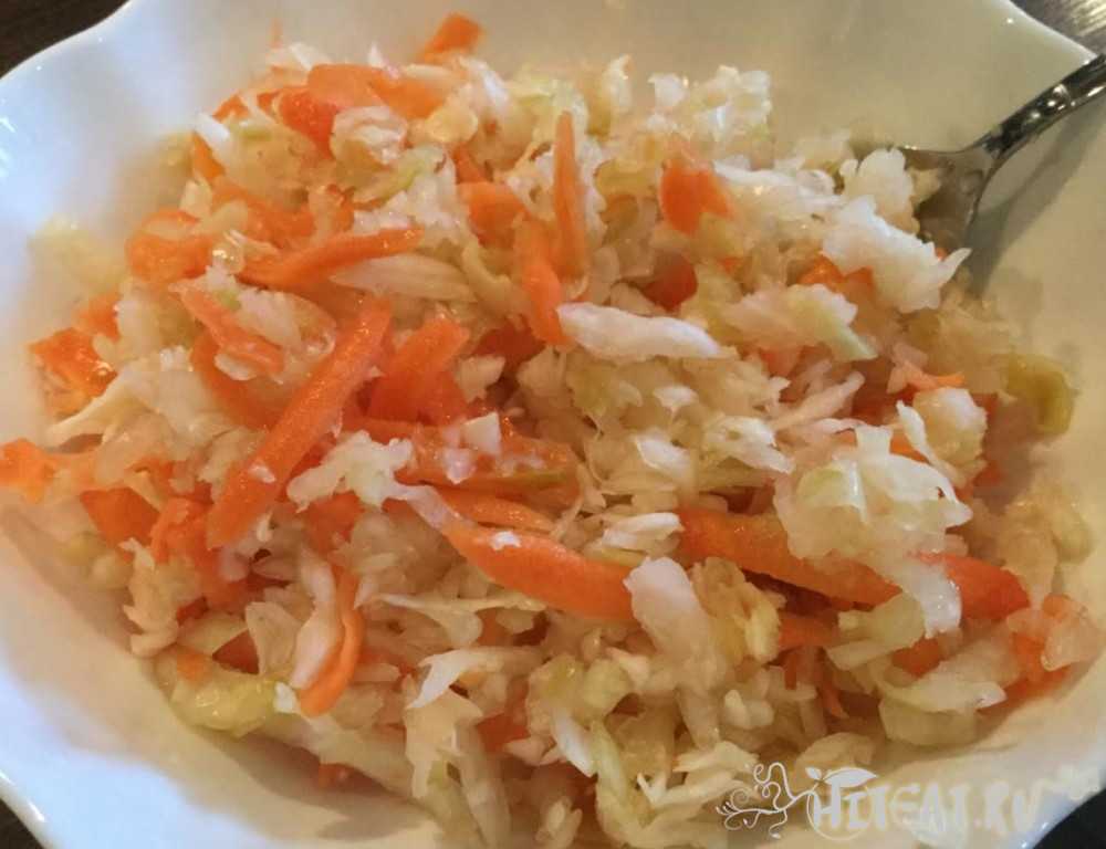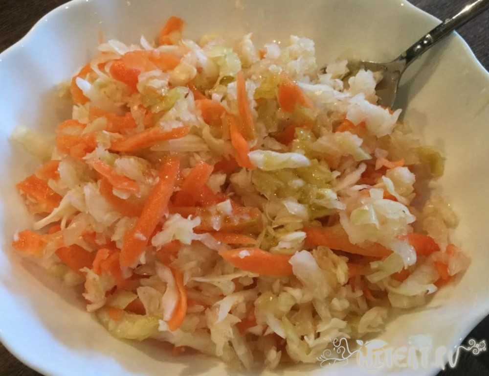 Приготовленная таким способом капуста ничем не отличается от квашеной, хотя готовится быстро. Можно использовать для приготовления ранних и средних сортов.