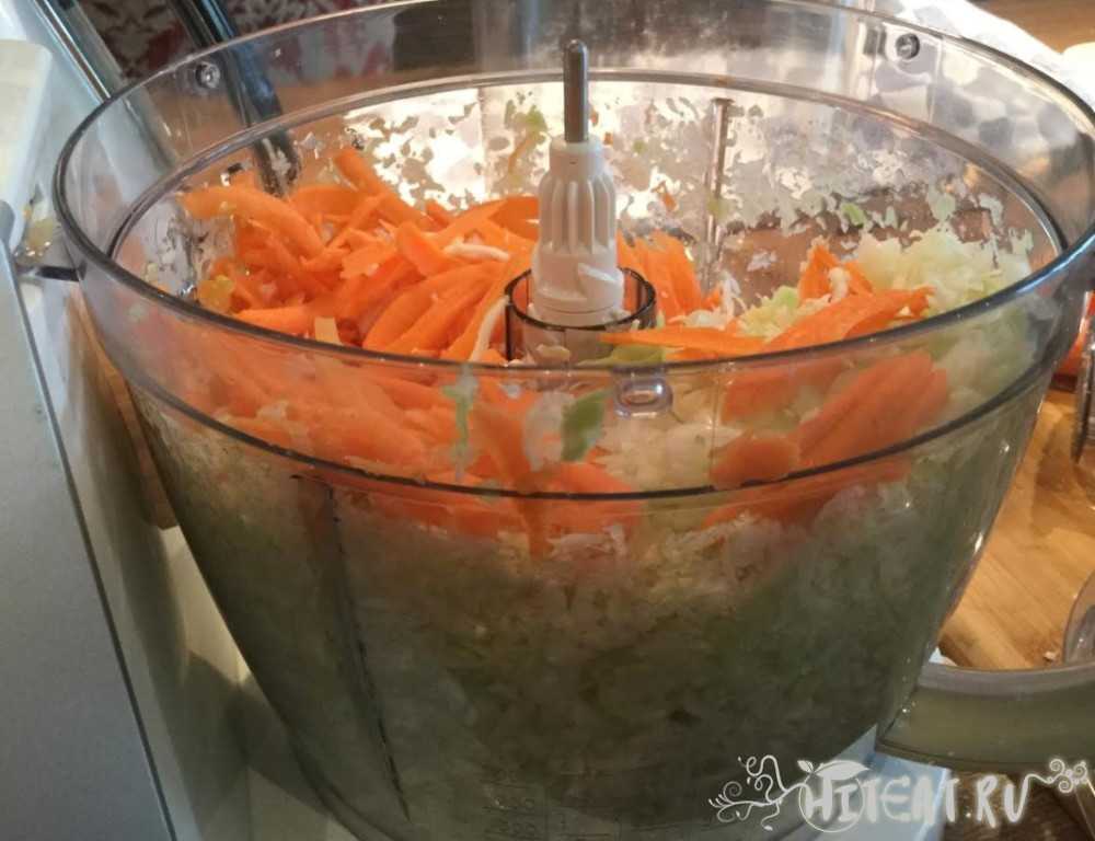 Морковь отправляем сюда же, измельчаем вместе с капустой.