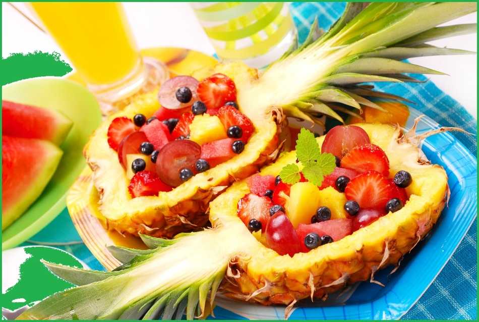 - Все ингредиенты смешиваются аккуратно в салатнике и перекладываются в половинку ананаса